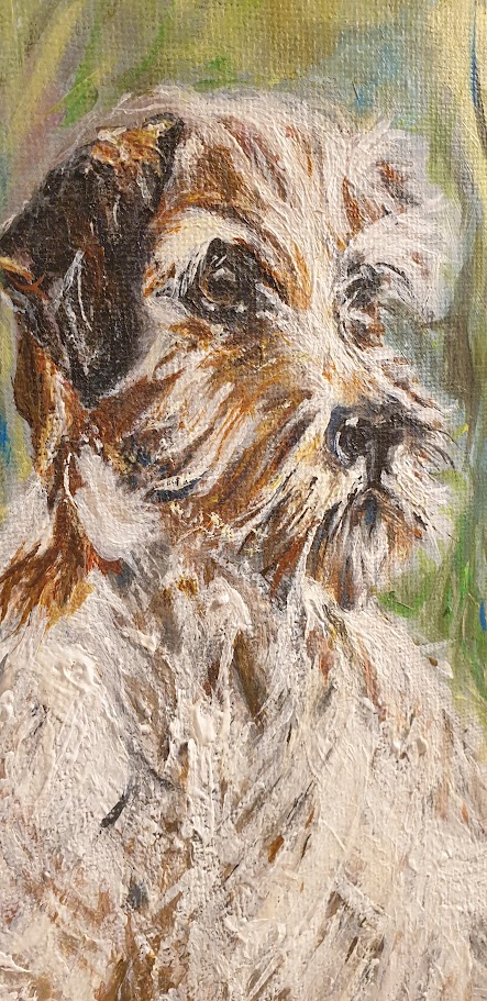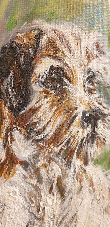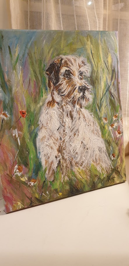 Scruffy Terrier in the Meadow, signed painting, on a stretched canvas.