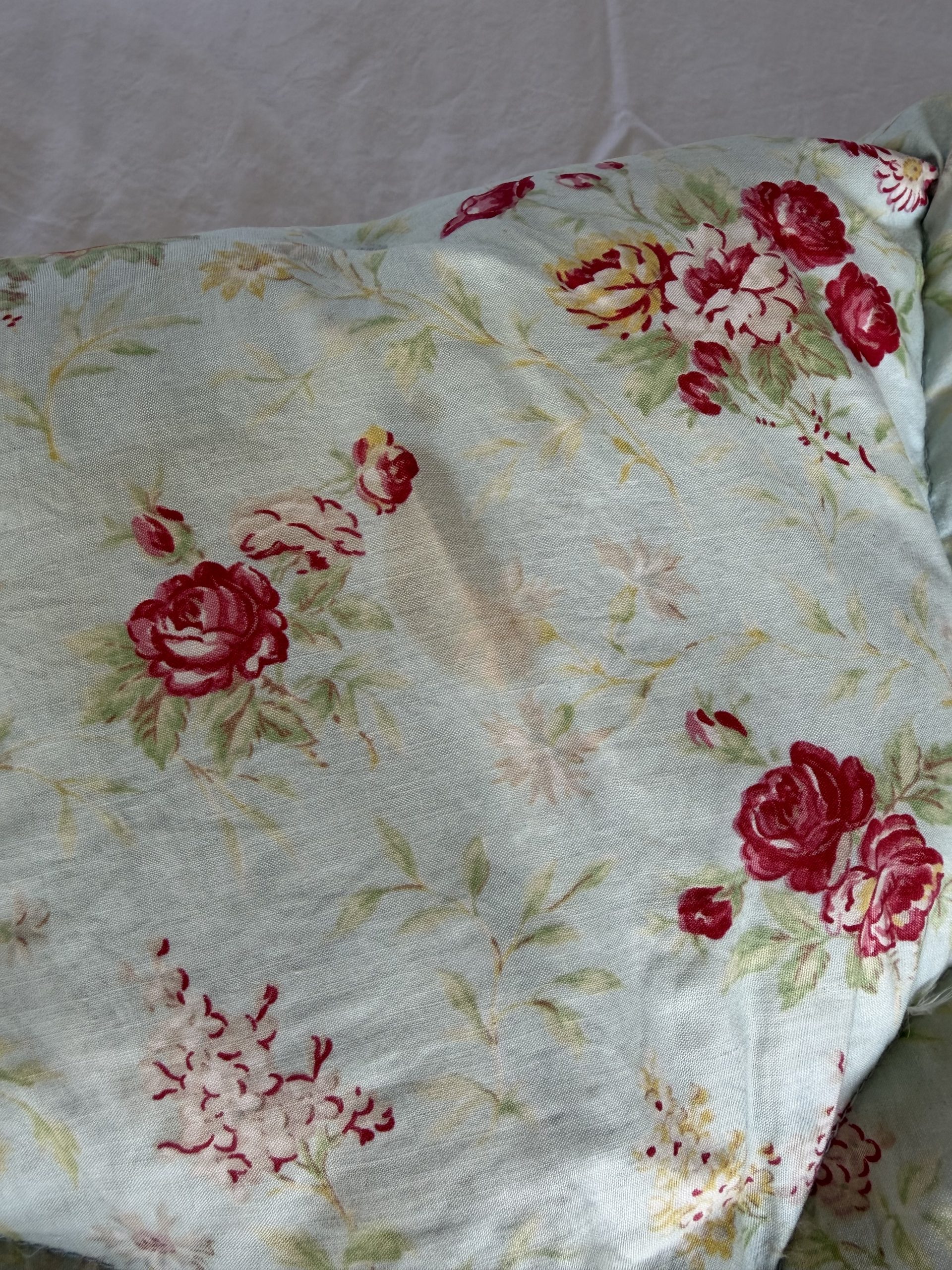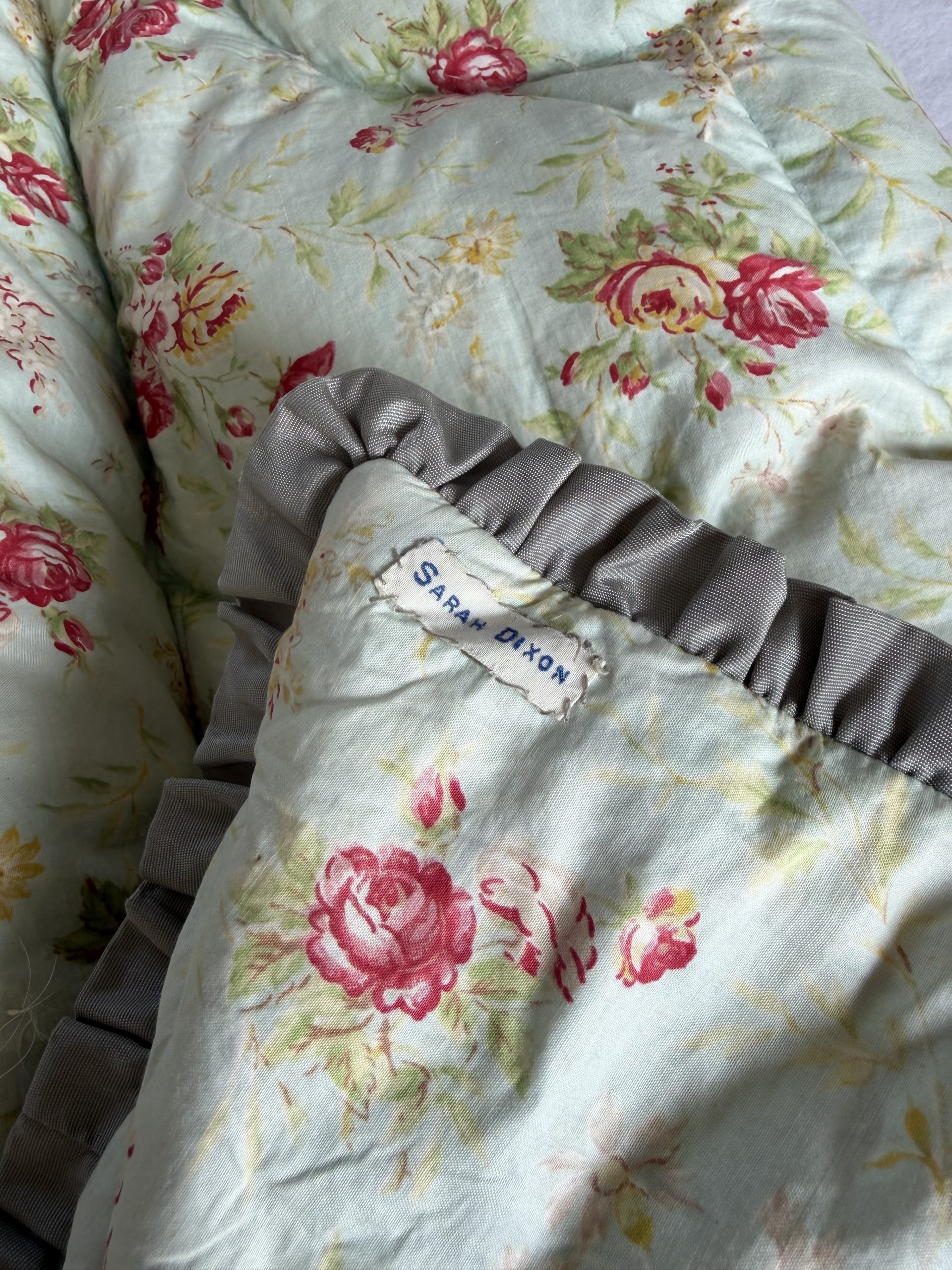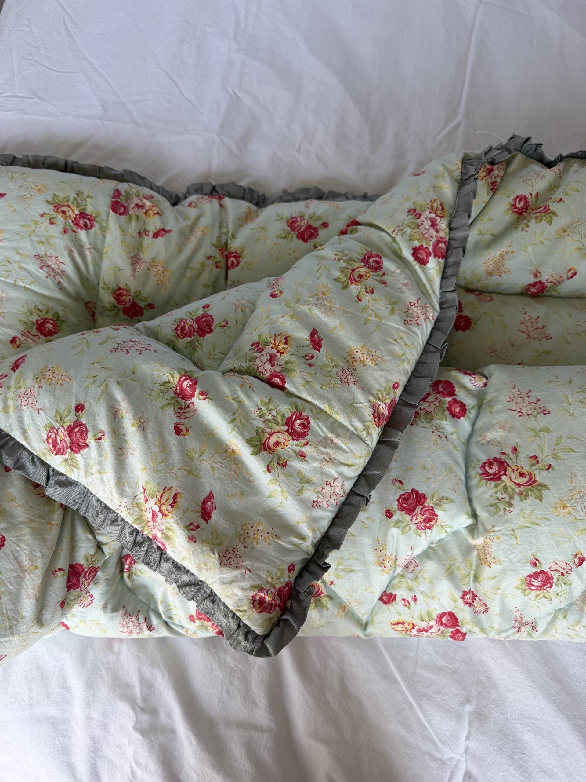 Vintage Feather Eiderdown Pale Blue with Red Roses pie crust grey edge.