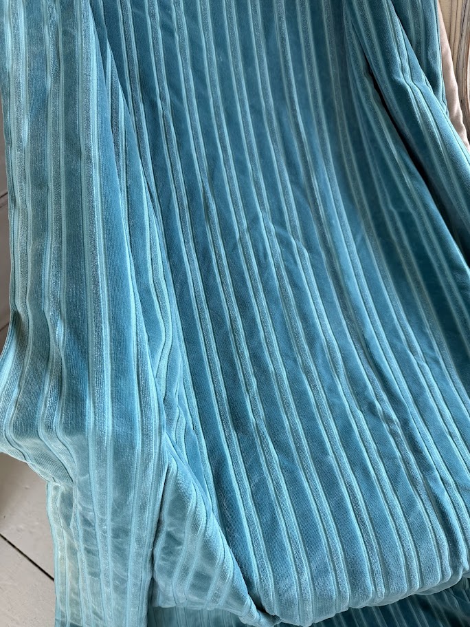 Gorgeous cut velvet stripe curtains in a peacock blue.